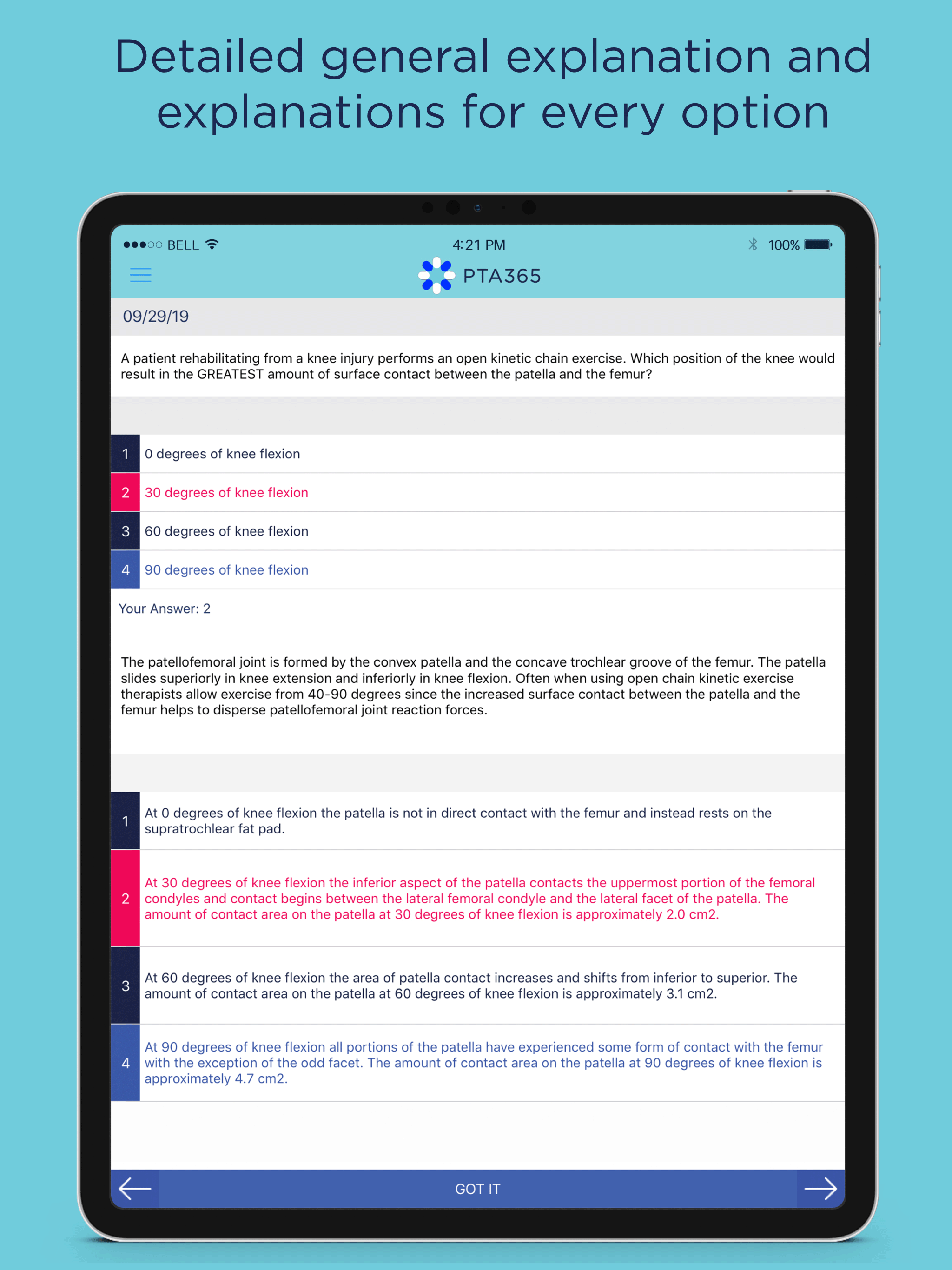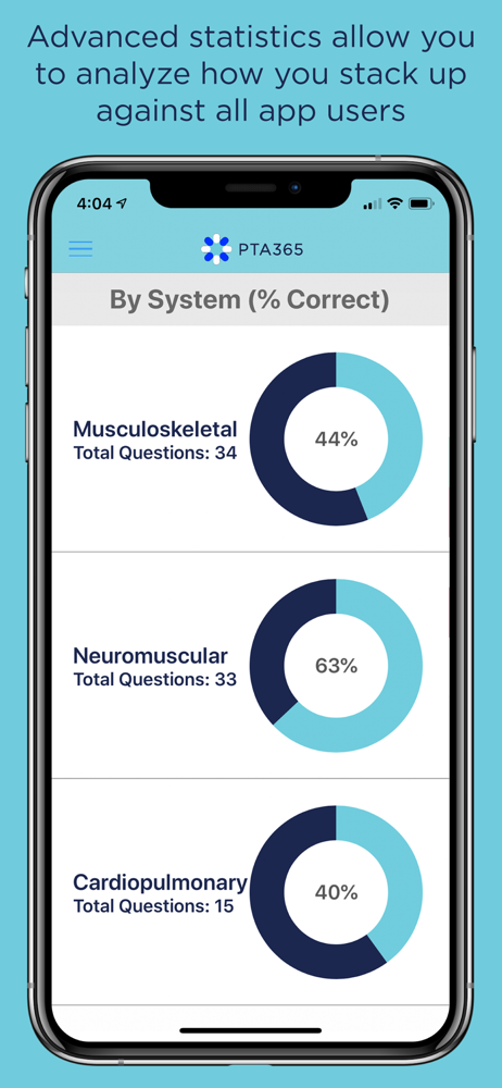 Wow!!!! The PTA 365 app is a great asset to have in your arsenal of studying tools. What I like about this is that it gives you one PTA board question actually used from past board exam questions. It tells you if you answered the question incorrect or correctly. If you did answer it incorrectly it gives you the resource where the answer can be found. What is really cool is that if you answered the question correct it gives you a cool blue color and if you answered incorrectly it shows the color in red. Plus, it gives you categories in which you need to study. So awesome give it a try.