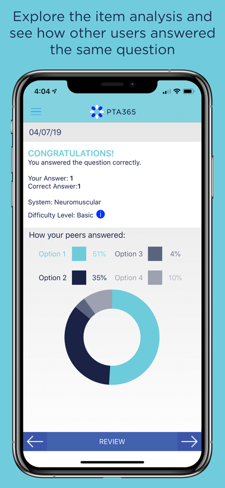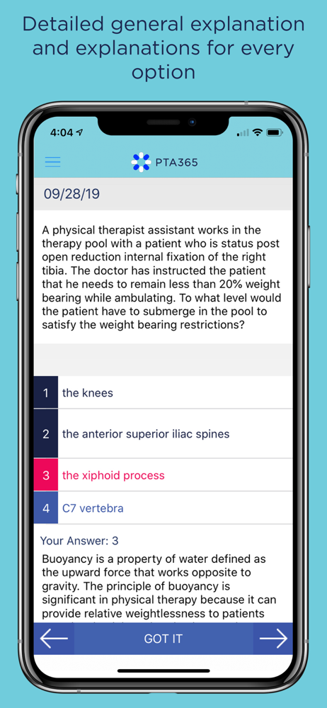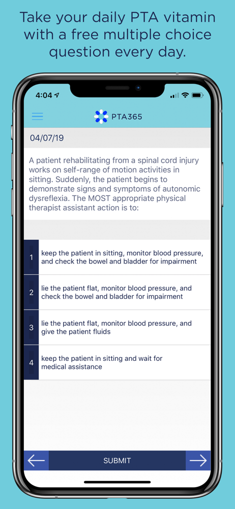 Love this FREE app! Itβs just one multiple choice question a day, but it shows why your answer was either correct or incorrect, why the other answer choices were incorrect, and how other people answered. It saves all your previous questions/answers and tells you how youβre doing by category and overall. I canβt find a way to get the app to send me a push notification to alert me to a new question, but even if I miss a day, I can easily go back to a previous dayβs question to answer it. I highly recommend this app if youβre studying for the PTA license exam.