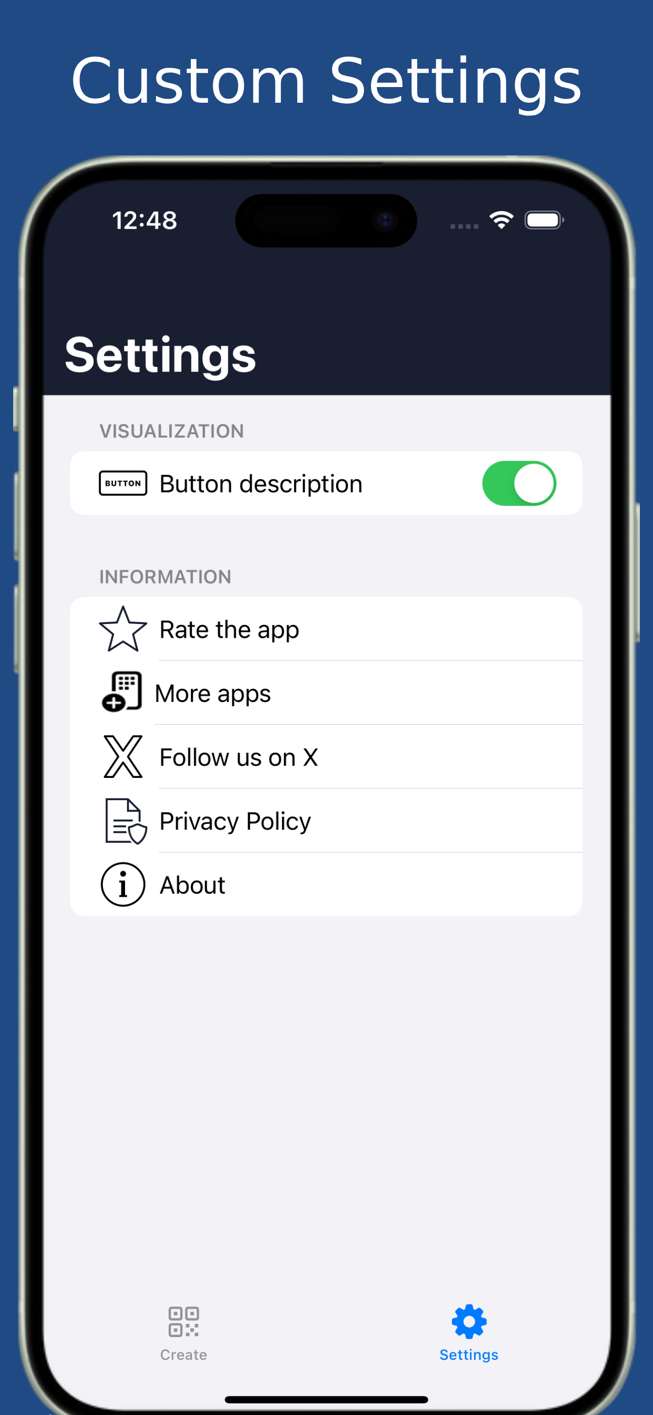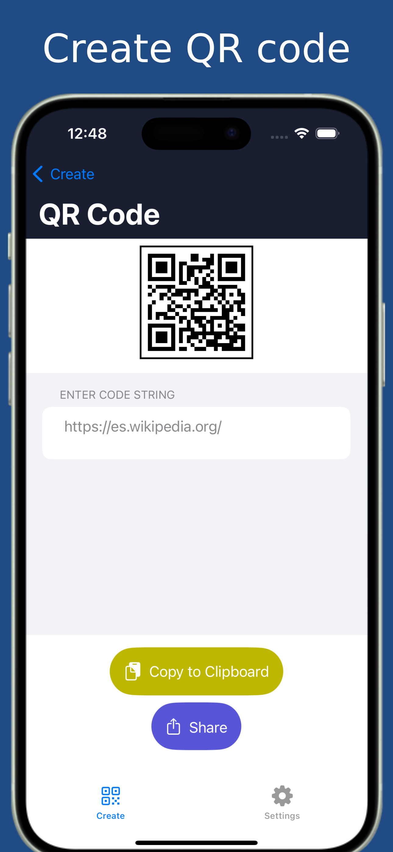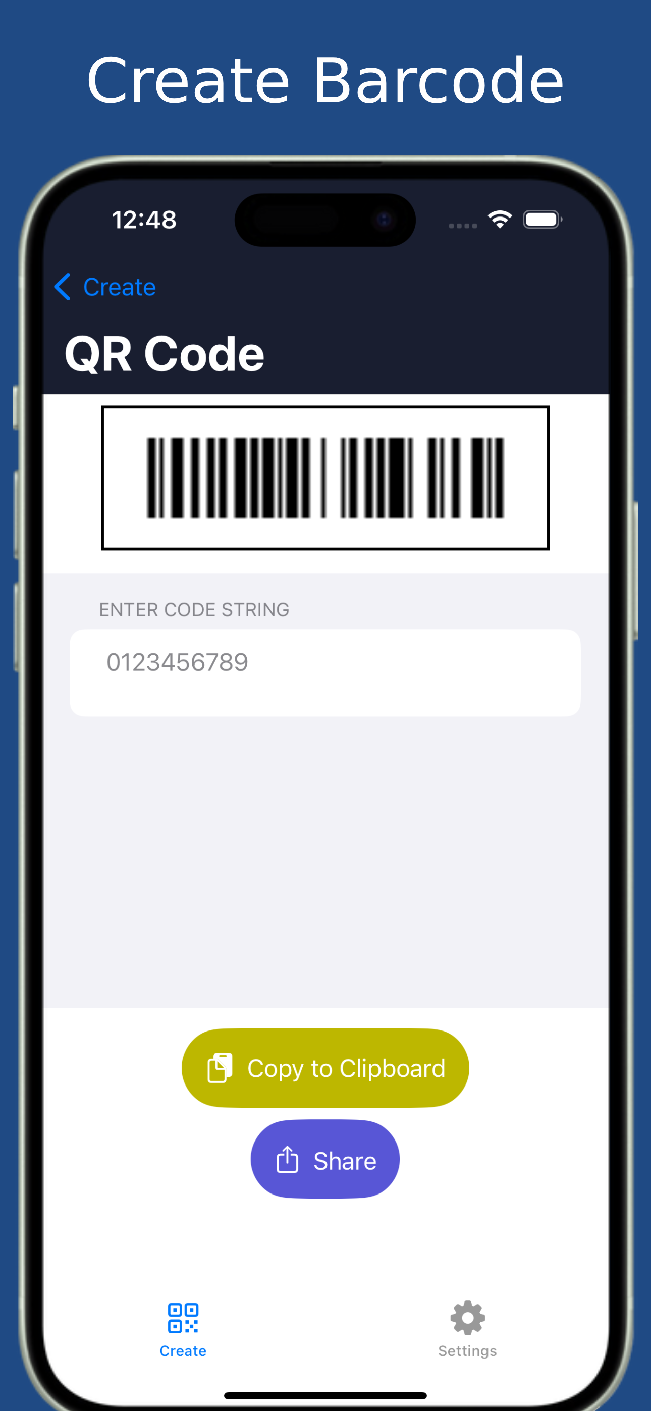 Create any QR code or Barcode you want. Once the code is generated, you can copy the code text to the clipboard or share the QR text code and image.