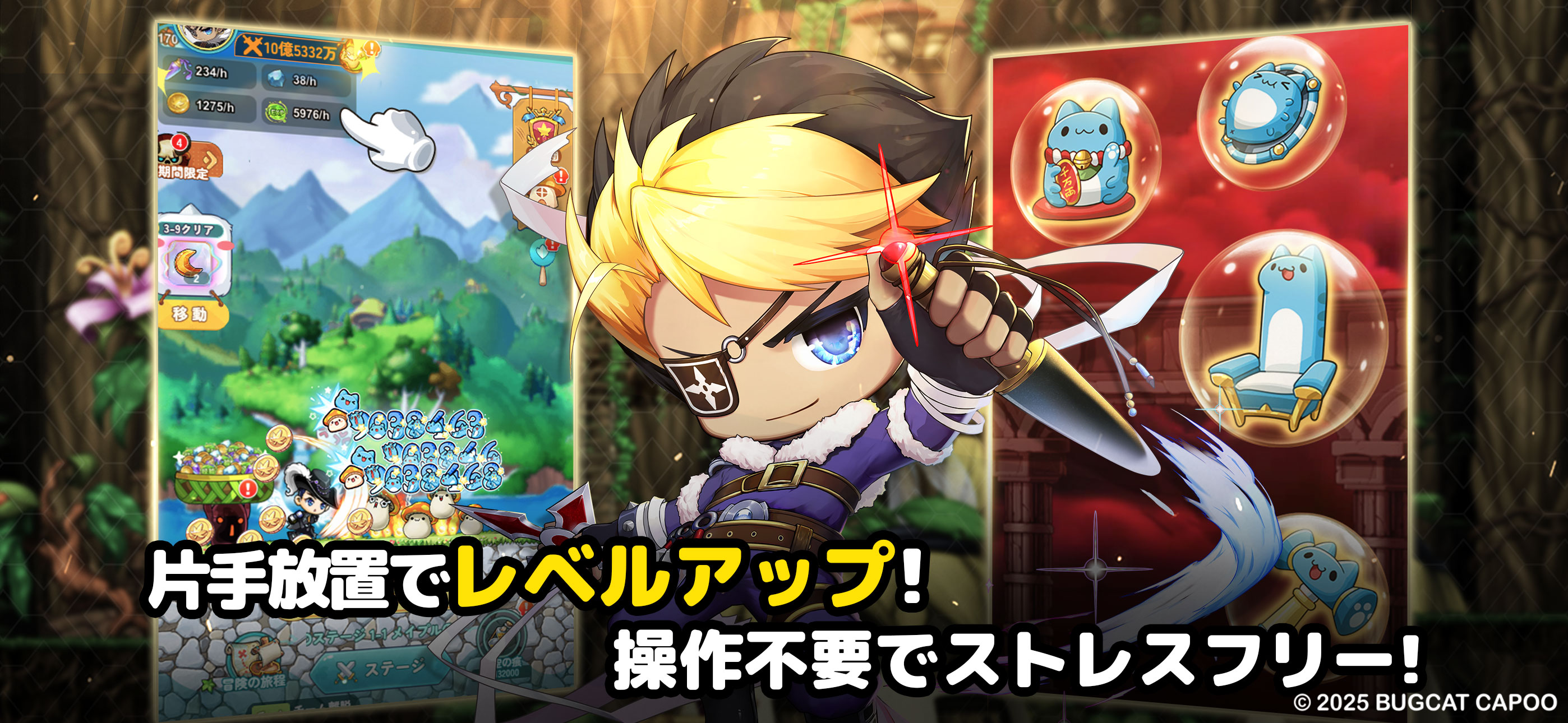初期のメイポを遊んでた勢なので遊んでみた。 恐らくチュートリアルを超えたくらいになってもイベントはただ見るだけ キャラが勝手に移動して、自動的に発動するスキルを「見る」 他のイベントもあるけど、ボスキャラが追ってくるけど、自動で最適な動きをして逃げるキャラを「見る」 キャラを強化をするのも初期のメイポなら書を使って失敗したいするハラハラ感があって楽しい作業だってけど、今作はボタンを押してただ数字が増えるのを「見る」 当時のBGMが大好きで、ボーッとする事が得意な好きな人はおすすめです 例えるならMMOから作業を抜いてその時間を画面を眺めるだけに変更した感じです