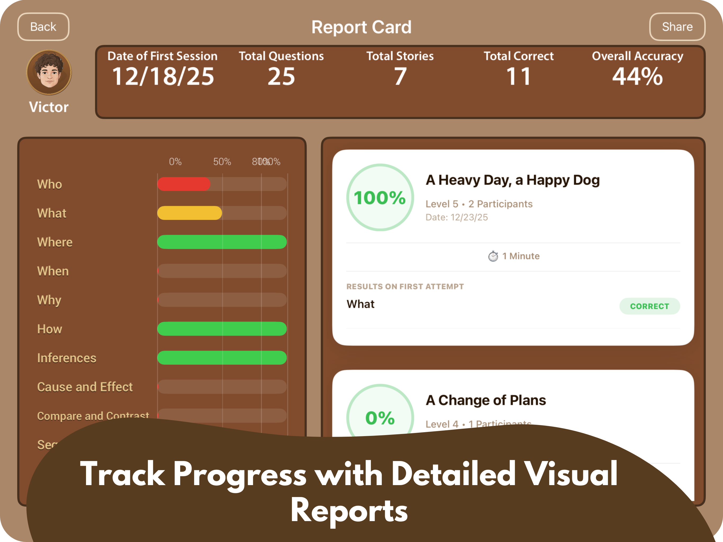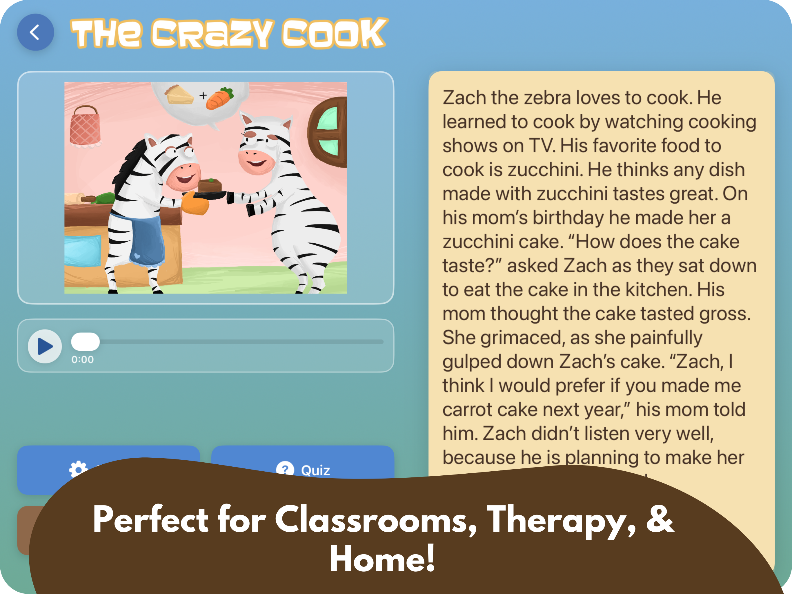 My life skills and LD students in high school love this app! Before I let them click the answer, I have the students explain why they are picking it and where they found the supporting information in the story. Then we check to see if they were correct. It helps the student learn to infer from the presented information. Most of my students are used to looking for matching words. If they do that, they have to explain if those matching words match the idea in the question. This app really helps the students learn the โhowโ part of answering questions.