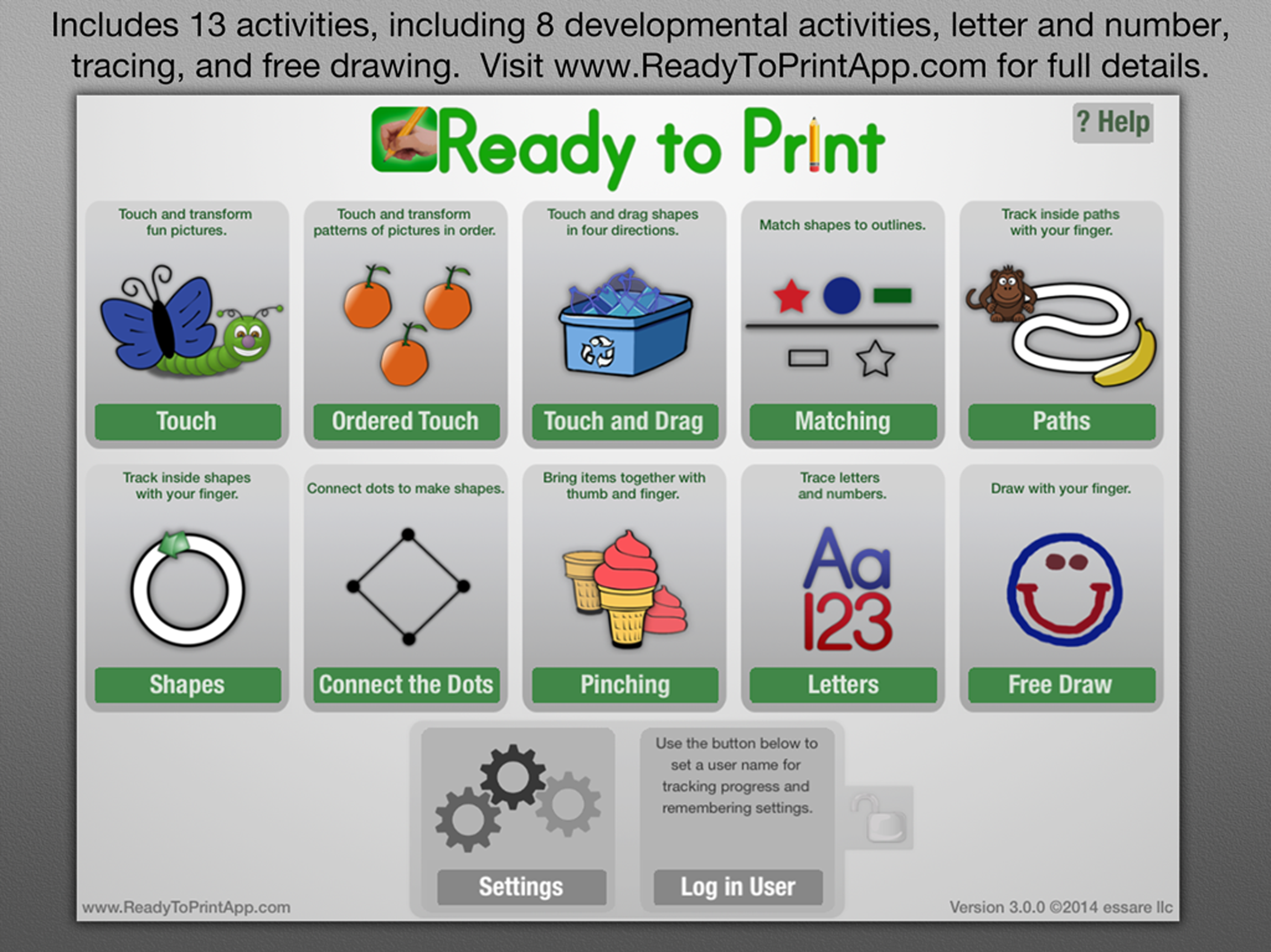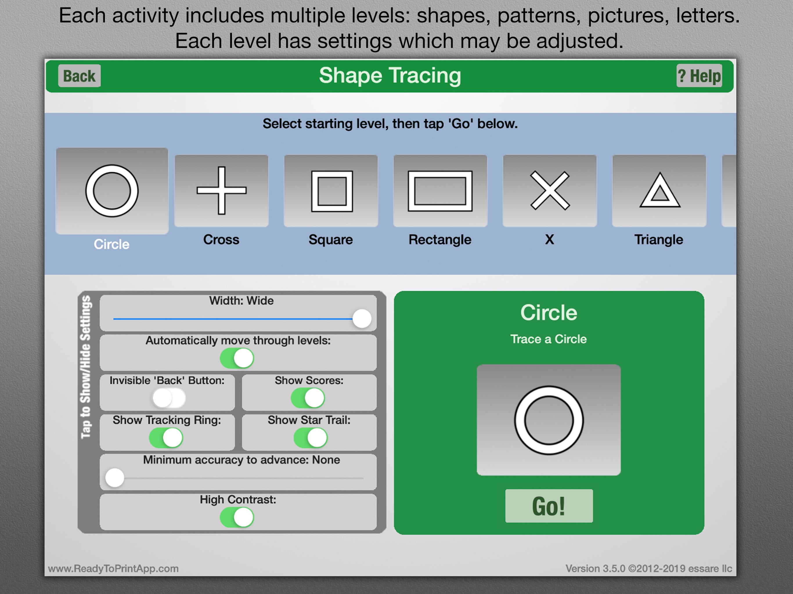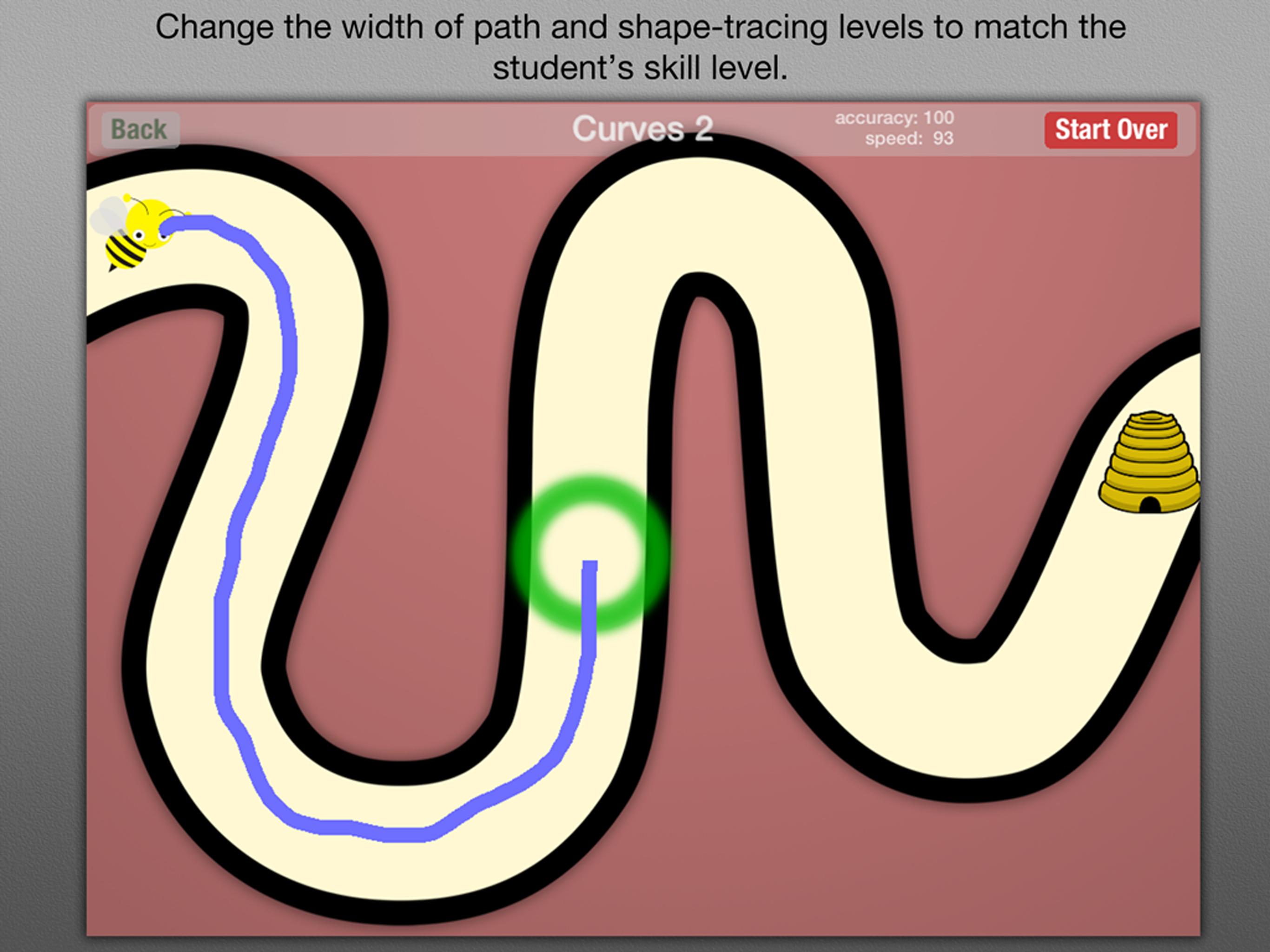 This app has made data collection so much easier and the kids love the activities. The only thing that would make it better is if the letter/ number task would allow me to choose what letters I wanted the child to work on and had options for the letter to have lines so the child can start seeing where the letter rests. This is the best investment I have made.