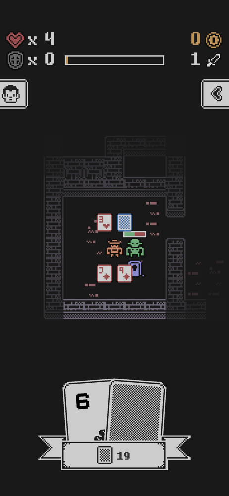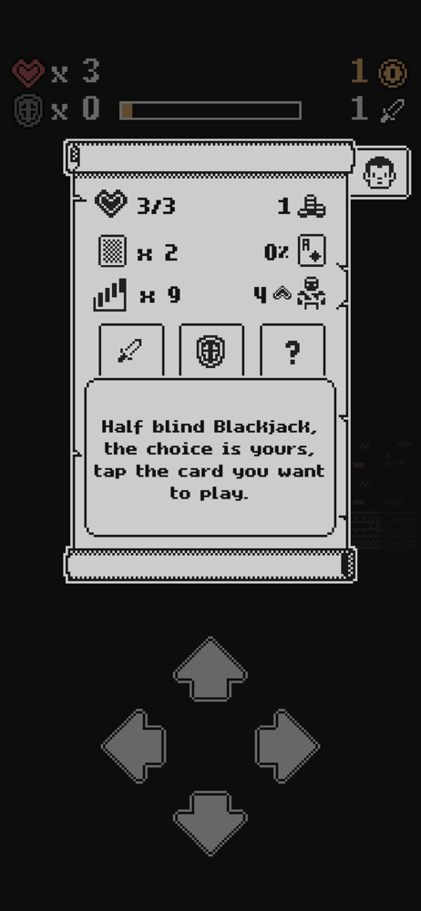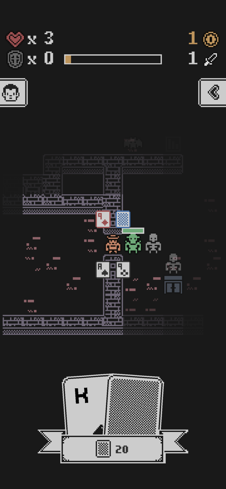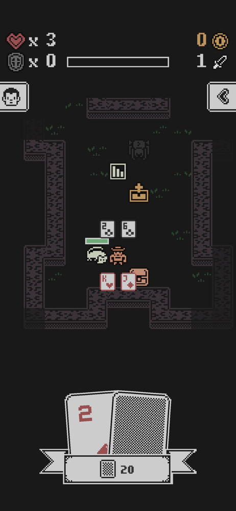 For as much as I love the concept of this game for its creativity and strategy, the very concept of blackjack-based combat is what makes this game so frustrating to play. With each level requiring more XP, I would expect to be able to get further each time I leveled up, but this is not the case. The mage is worse than the prophet, and more XP is needed, making leveling up that much harder. Requiring all XP to be obtained in a single run, while understandable, means that you have to be the luckiest youโve ever been in order to level up, and this can get frustrating from a gameplay perspective knowing that ultimately, no matter how you play, you are at the mercy of the cardsโsomething especially aggravating after having the ability to see them taken away. Iโd change the order of the classes. There are other smaller issues as well: - Keys are obtained not from a random enemy, but from the last enemy, forcing you to completely clear the floor to continue - The shortsword (โgleemingโ) and the Fuegomaker (โememyโ) both have misspellings in their descriptions - The XP gotten from looting your grave is directly related to the amount you currently have, as far as I can tell, making the use of the altar extremely damaging to the player, as it requires them to have an even more perfect run to reach their grave normallyโthe only way to get significant XP from it.