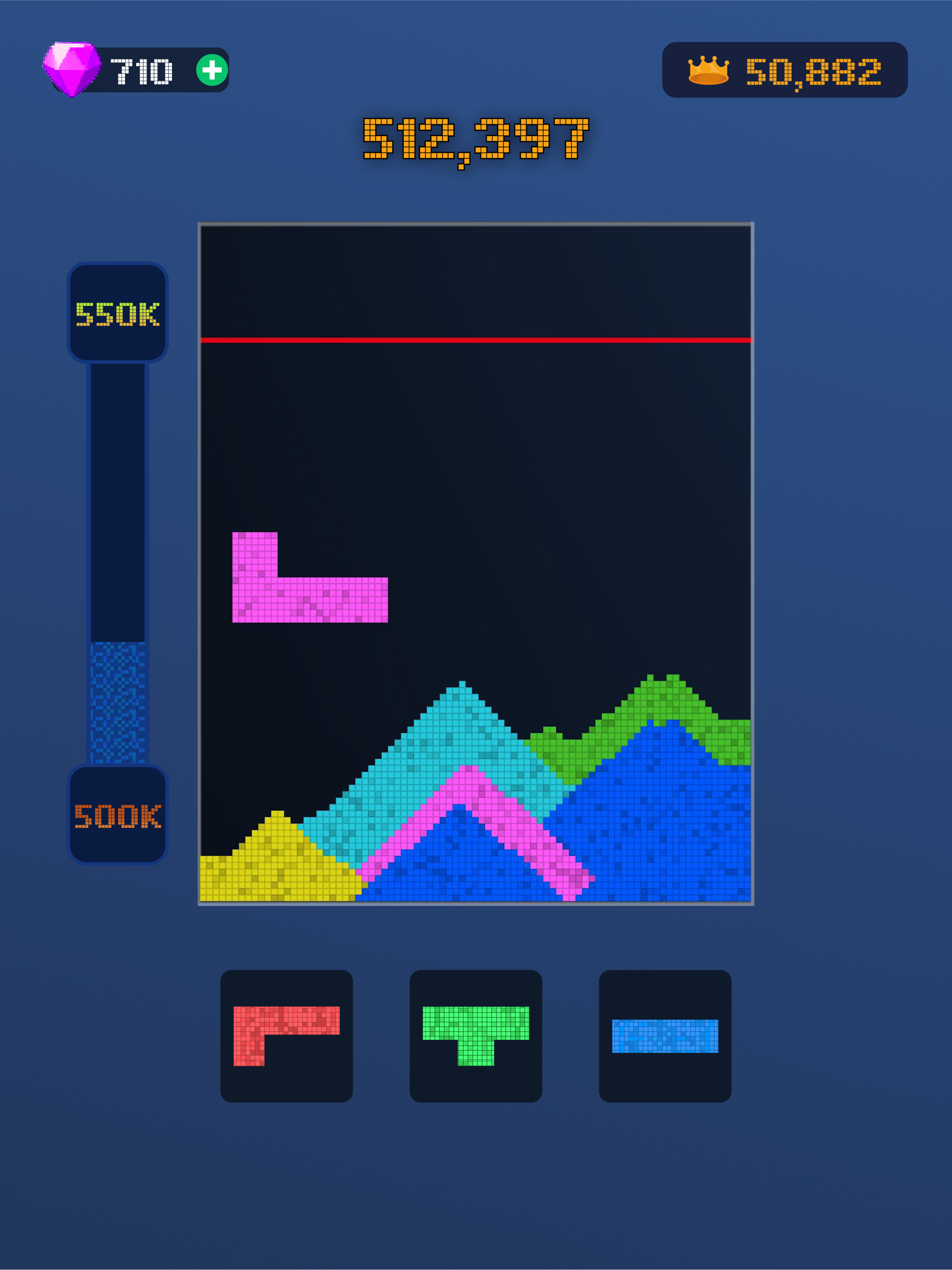 I was bored and saw a playable ad of this game, so I went ahead and downloaded it. Ive been playing it for the past hour or so, and to my surprise it’s still entertaining because of its creative design. There’s a nice effect when the sand is dropped and when a layer is cleared, and my favorite part is that, by watching an ad, you can get basically unlimited revives after the sand reaches too high. It’s fun for me to forever increase my score without having to restart. Something else I find really interesting is the ad breaks. Nobody likes ads, and I found it annoying when every so often, one would pop up on the screen. But after watching the ad, you’re rewarded with a gem which can be saved up and used as a tool to clear sand layers. More games should definitely include that reward feature. Sure, you have to watch an ad to continue playing, but there’s a reward that comes with it so just by playing the game over time you can stock up gems to use. I’ve played Block Blast, a similar game, and have never beaten my (grand) score of 30,500 points, which made me bored that I couldn’t surpass the number. The points system in this game is more fun than that, and I definitely recommend playing it!!