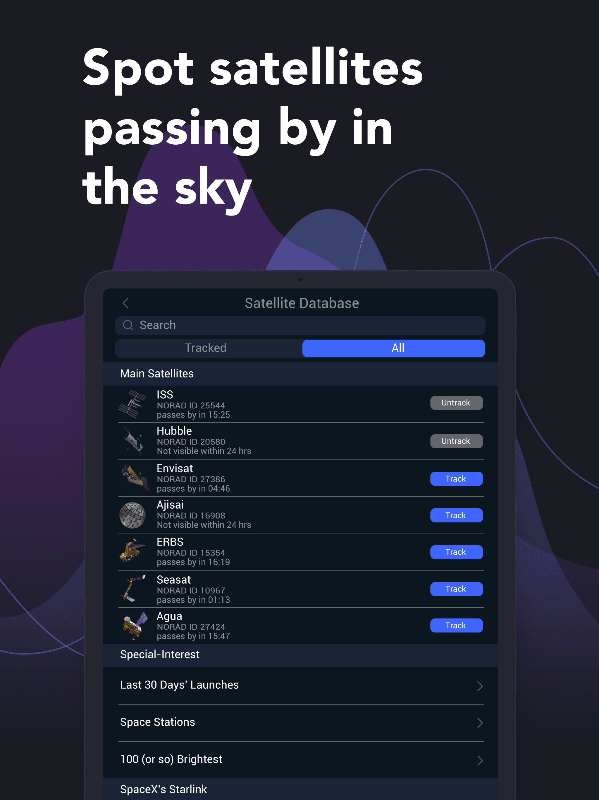 Observe the International Space Station in the sky above you and find out where human-made satellites are right now with SATELLITE TRACKER by STAR WAL...
