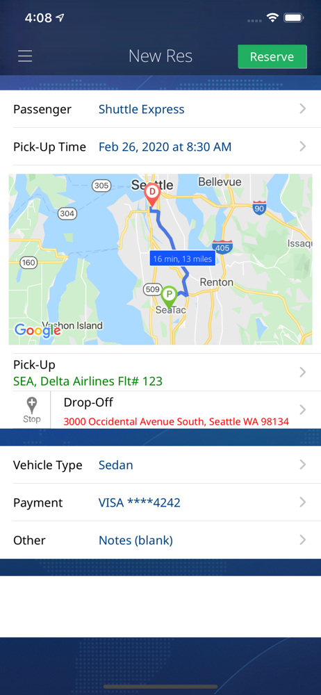 As other reviewer noted no way to link online reservation to app, but supershuttle app does this no problem and you get lots of notification pushed with ride updates. Emailed reservation confirmation did not directions as to how to get to Ride. Was very confusing finding desk in Seattle airport. Arrows show uturns make no sense. Waiting outside in cold. One info guy at SeaTac told me to go to courtesy phones to call in and that was wrong. Have to go to desk and follow “door to door vans” signs which show you make a uturn and make no sense. So poor shuttle express app and customer direction and poor seatac signage review. SuperShuttle much better organized and app is flawless but they are not located at SeaTac.