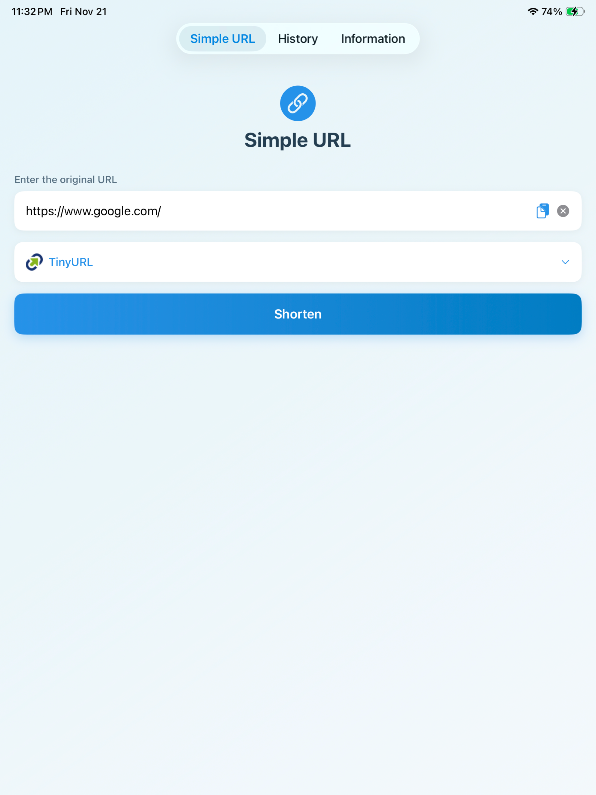 Simple URL Shortener * Features - Shorten URL - Auto copy to clipboard - Send SMS - Send E-mail - Share with many different apps * Shorten URL wi...