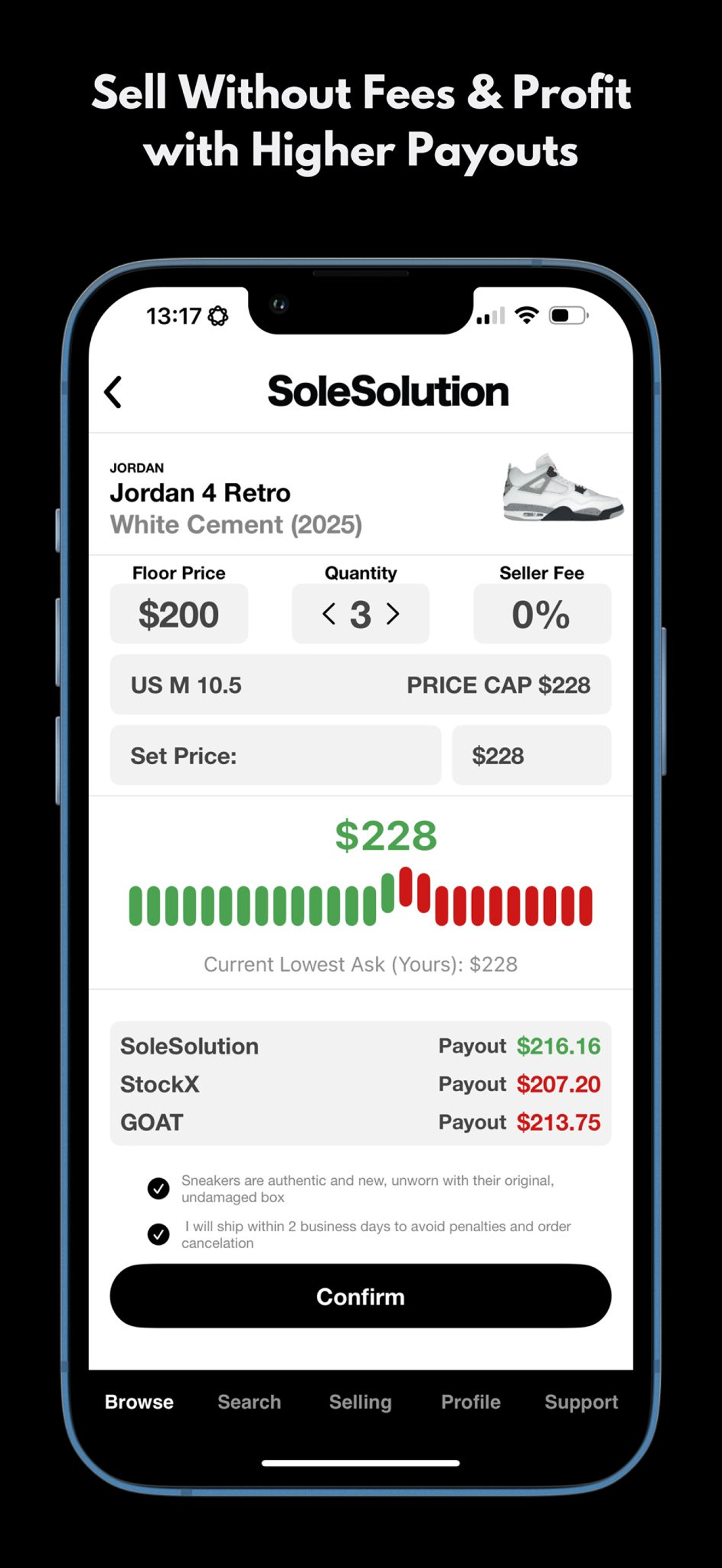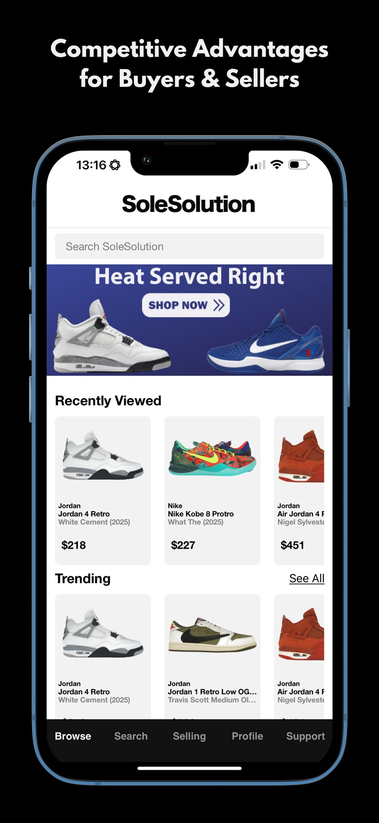 SoleSolution is a game changer! I ended up grabbing a pair of White Cement 4s for under market and they shipped same day. The app is super smooth. Easily the best prices I’ve seen anywhere (which they stand by). If you’re into sneakers this app is a must. 5 stars easy.