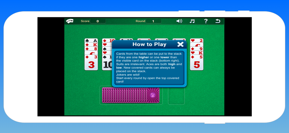 Fun and addictive Solitaire. Instructions: Cards from the table can be put to the stack if they are one higher or one lower than the visible card on t...
