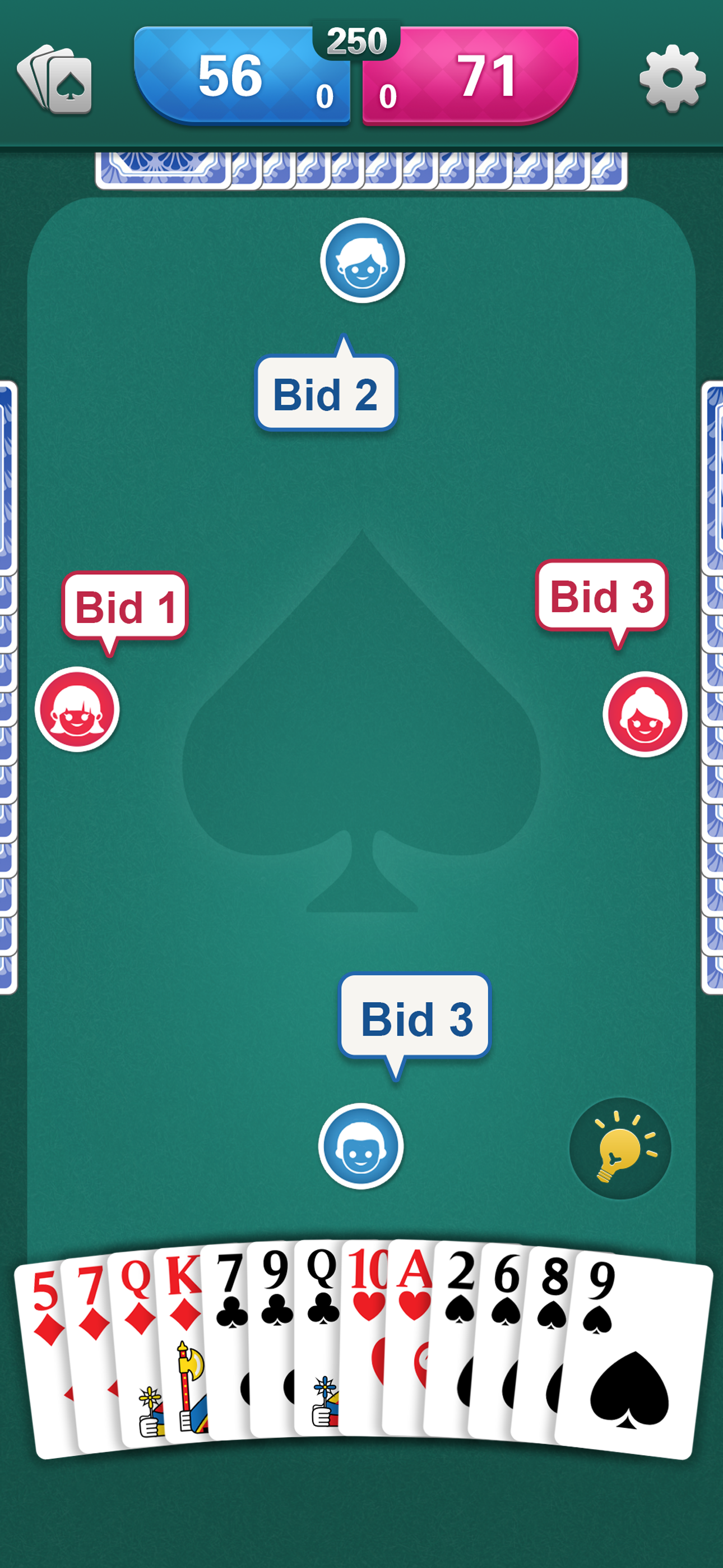 The best AI/Bots I hav found (so far), and the ability to select options for types of spadesโฆi.e. blind nil, 250 or 500 point game, makes this one of the better onesโฆ EXCEPT for all the ads! I donโt have an issue with an ad between each game, but one between every single hand makes it a huge drag and really knocks down my rating.