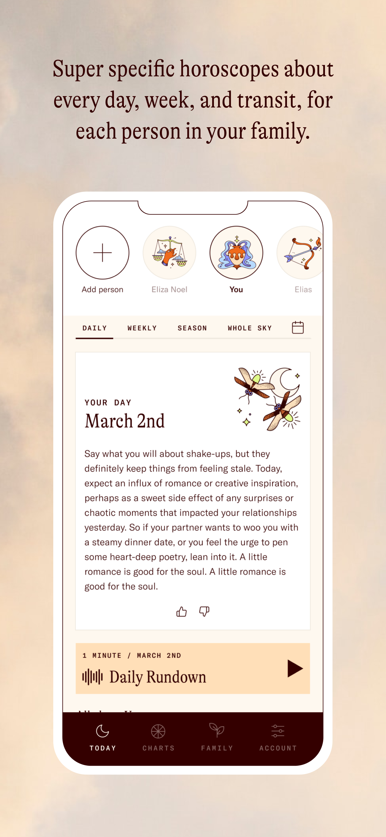 I have been excited for this app to release since I learned about it on Instagram months ago. I love the UX/UI. The price seems steep - with a basic/free account only giving you info on your big 3 - but it’s a small team of people who deserve living wages. The guides are deep and detailed, with helpful little mantras sprinkled in. I find the content helpful and fresh, but a little redundant. The “this week” and “this season” overviews are long and in depth - depending on the day, this is a plus, sometimes it can feel overwhelming. I would suggest making the dates (ex. Tues, 3/19:) under “key moments” bold, to distinguish them better for the reader and separate the heavy flow of text. Further suggestions: I would include the ability to add a co-parent, a synastry section to see how your placements directly interact with your child’s - as right now, it’s siloed per individual, and possibly an educational or engaging section for your child - whether it’s geared toward astrological insights or mindfulness and self-awareness (this could just be the guides but written for them in a digestible language).