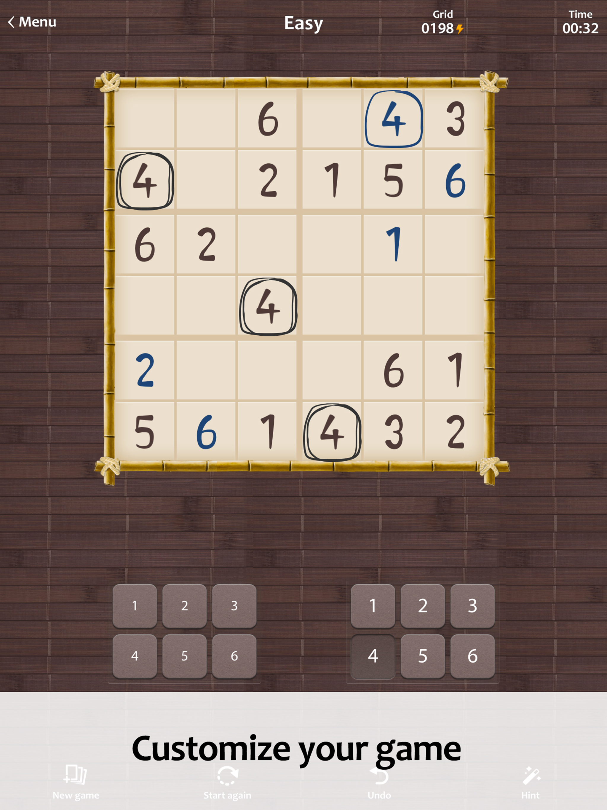 I like your game. Although I haven't tried a great many sudoku game apps, I can see that this is one of the best. Many thanks. I like playing the game without using the pencil -- trying as much as possible to remember the set of available numbers for each of the empty cells. I am not good at memorizing and sometimes it takes almost an hour to complete a game, but it is more fun for me. I have only a couple of suggestions which I hope you would take into considerations for your future update. 1. Status bar: I think people would like to be able to check on the time, battery status, etc. without having to end the game app. Maybe you can leave it up to the users by adding an option that toggles the display of the status bar on and off. 2. The Impossible level: Well, well, the games in this difficulty level are not nearly impossible. A little too easy, actually. I have played a few dozen games so far but I could solve every one of them without even having to use the pencil. I would like them a little more straining for the brain. That's all. Thanks again!