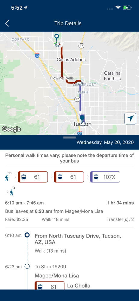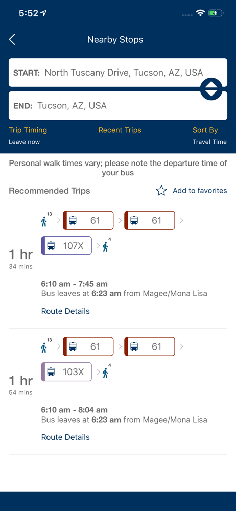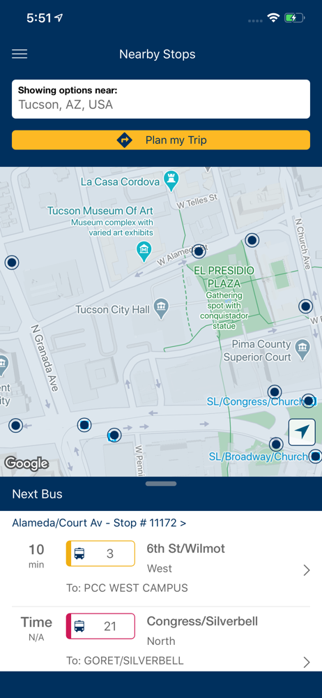 I love this app and I adore our free (currently) Tucson busing system. I often don’t need the Plan-a-Trip functionality as my trips are routine until I do need it and for the past few days it no longer recognizes locations by name nor by their verified accurate physical address. It will show the name of said place in the listing but when I select it and the screen returns to the map I get a small white pop-up box that says, “Unable to find location” and then quickly disappears. For example, it shows a listing for the Downtown Ronstandt Transit Station but once I select it, it shows the “unable…” pop-up. This makes navigating new places terribly inconvenient at best and means I have to manually try and figure it out but going in and out of multiple “track a bus route”, write down the times, and pray I have figured it out. Trust me, when I need more than two buses, this is a challenge I wouldn’t wish on my enemy.