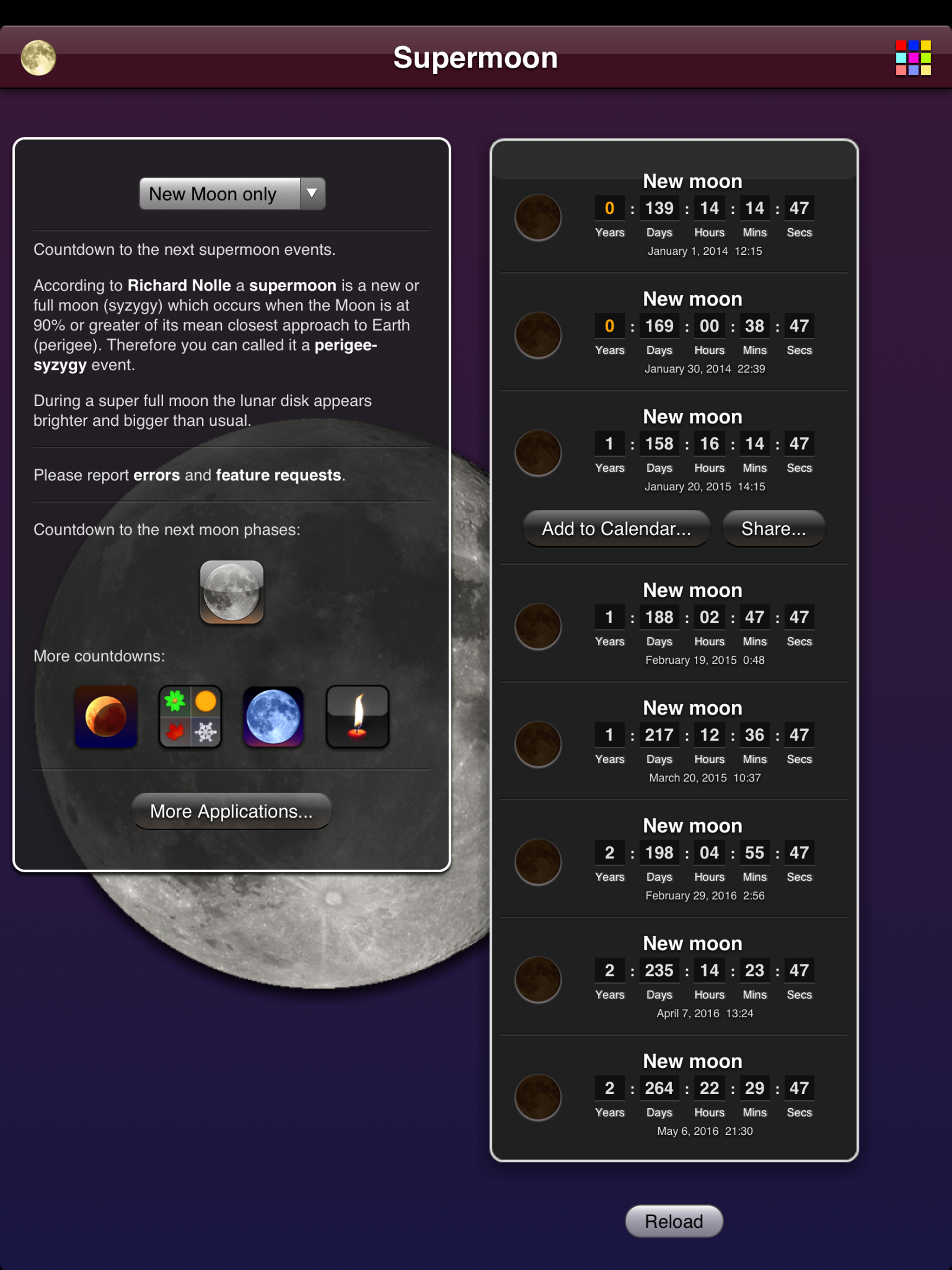 Don't miss a bright lunar disk and countdown to the next supermoon events. Supermoon: A supermoon is a new or full moon (syzygy) which occurs when th...