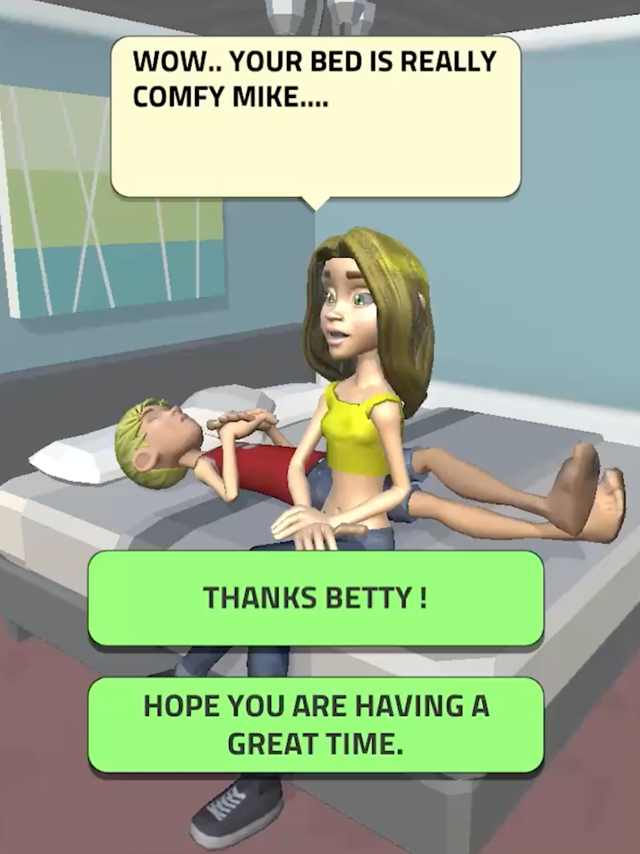 this game is bad for little kids like it looks like a life simulator game at first but it's insanely inappropriate right now as I am writing this the age restriction is 12+ like I know at this point the people who it is targeted for is have already had sex education but it's not like they can only download it. Little kids could download it is inappropriate for them. Also the graphicsโs are horrible the person who made this is probably 3 years old. like itโs just that bad Welcome the the end of the review if you have made it this far you deserve to know that I played this game and I need to say this we need more levels because when you reach the end it just starts all over again. Goodbye thank you for reading this review.