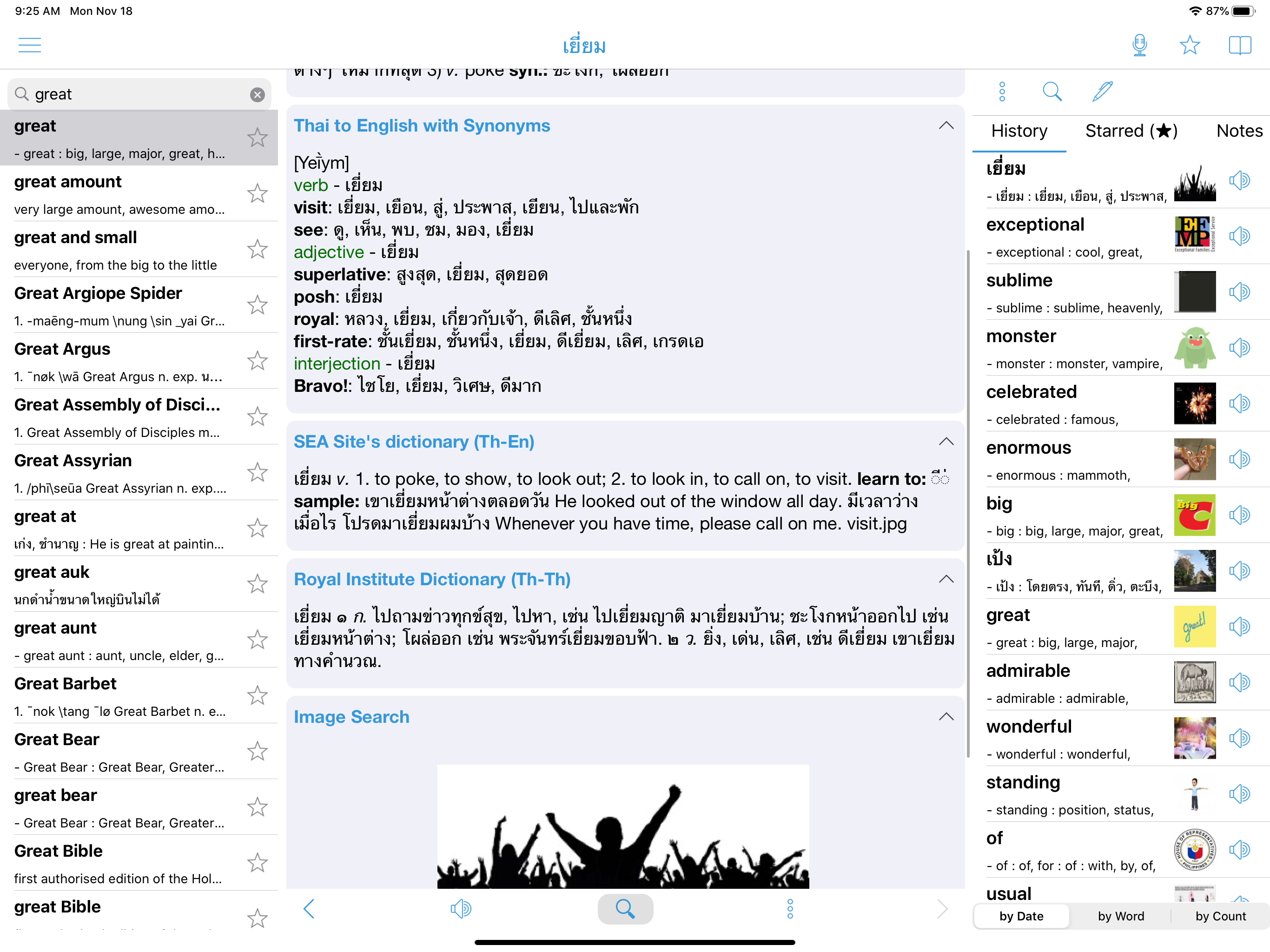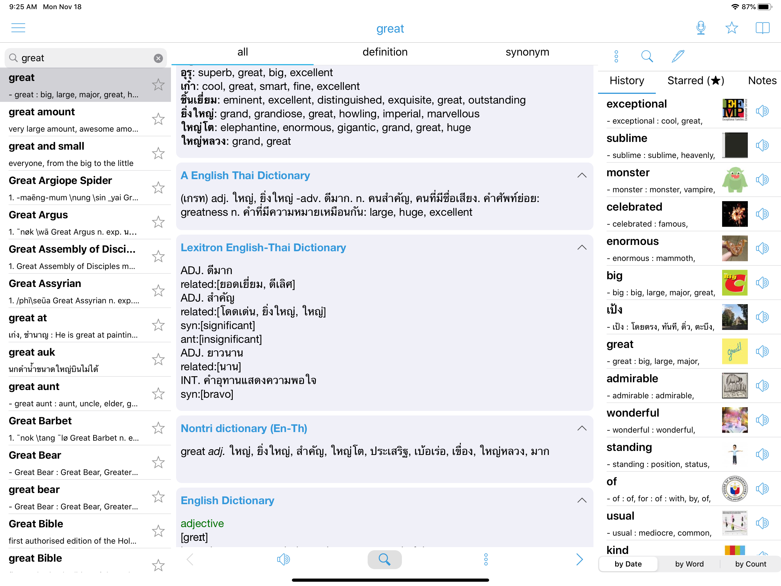 This app ROCKS! I am a farang, but I speak Thai. It’s been 40 yrs since I lived in Thailand. I’m headed back there now, so I needed to do some brushing up. Other apps don’t offer half the abilities of this app. You can speak English or Thai into the microphone, and it will bring up the word along with options, examples and synonyms. Click on any word and it will bring that word up. Click on the speaker icon and a Thai voice will pronounce the word. You can also type in words—Thai or English—in the search bar and go about your search that way. Get it! Don’t bother with the other ones.
