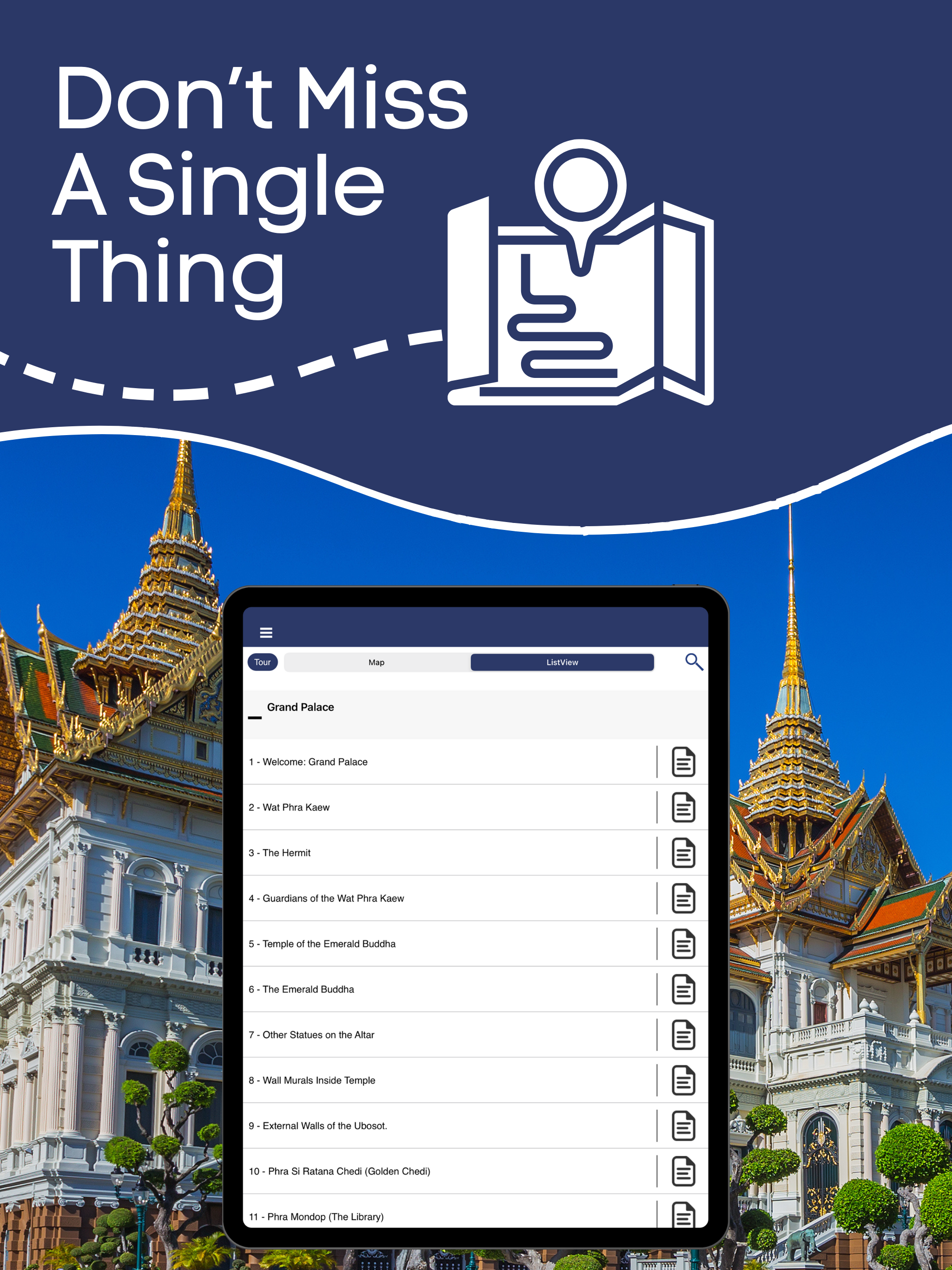My wife was very frustrated with the local guide and his negotiation. We downloaded this app and used it. We had used it at another temple and decided to try it here also. Great story. A lot of details ! Everything about the Emerald Buddha ... his birth, his travel, wars association with him, his three outfits etc.. It is such a large location. It is easy to miss something. The app gave us a route and we walked it fully. Nothing was missed out. I would like more stories of the inside room of the temple. A lot of pictures are on the wall. There is a whole story written in pictures but it is difficult to read it. That is my only feedback.