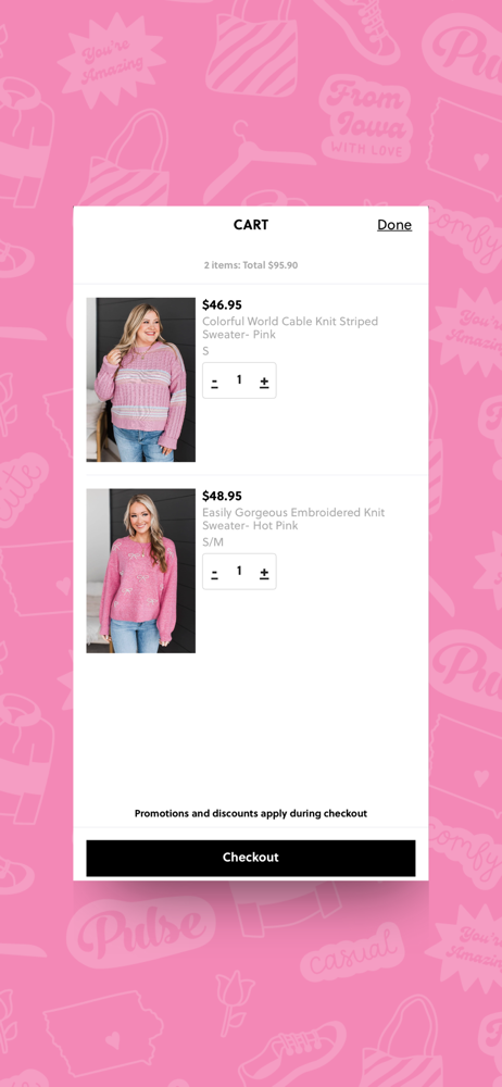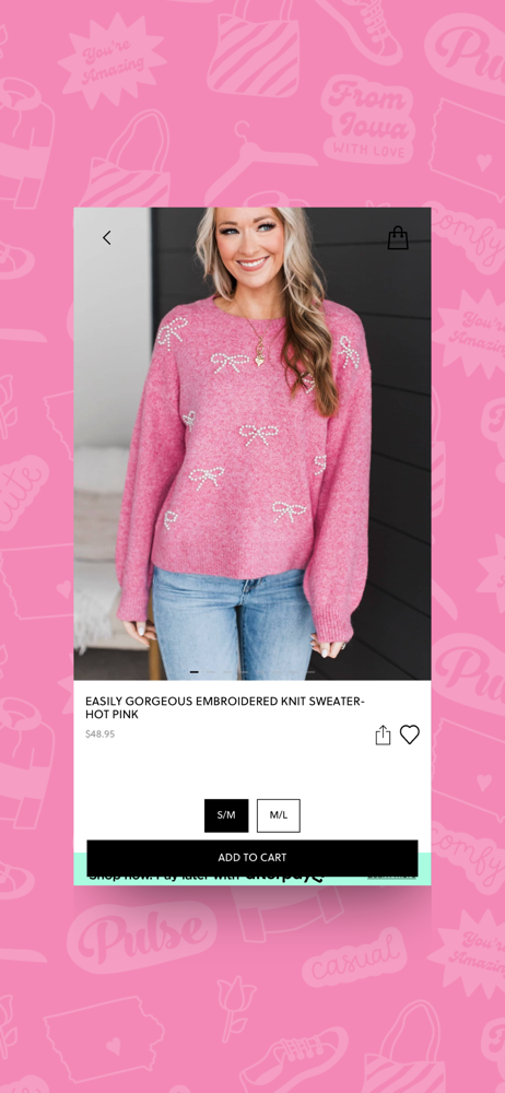I love Pulse Boutique! The clothing is great quality at a great price. I love the multiple photos of each item and the descriptions of the models for reference. Everything Iโve ordered (and itโs a lot!) fits just as expected. Iโve never had to do a return! Always fast shipping and the app for my phone is so convenient- maybe dangerously so- I seriously love shopping here!