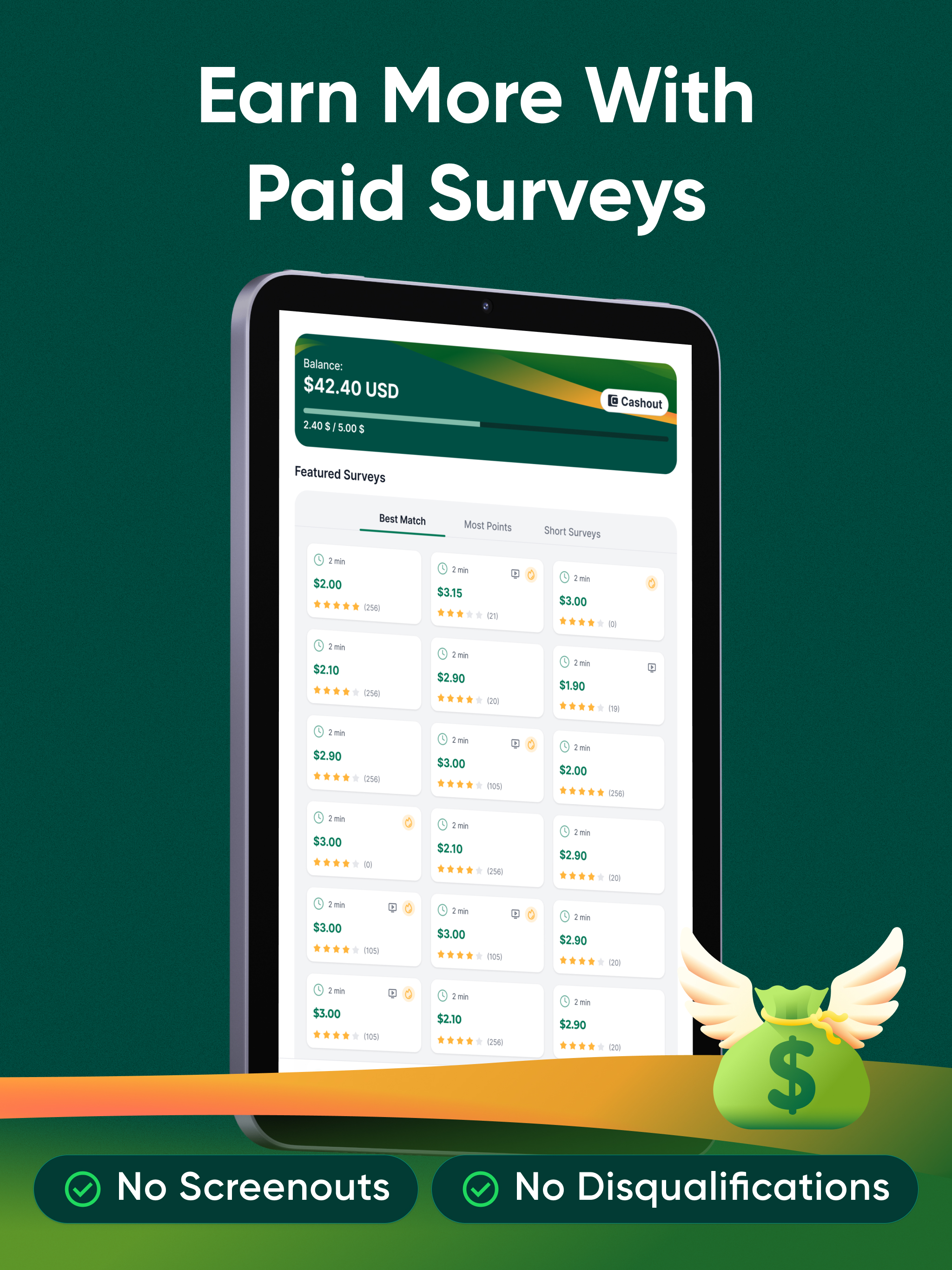 No more disqualifications or screenouts. Surveys tailored to you! Earn money for every minute you spend on TopSurveys. No time wasted. just guaranteed...