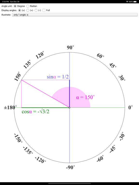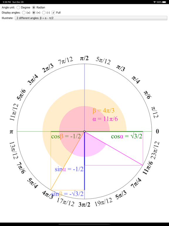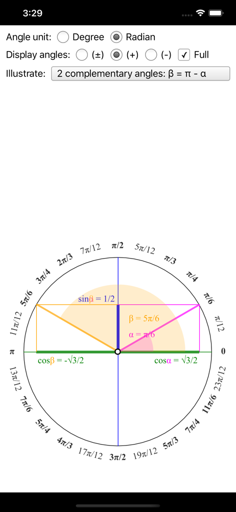 Learning trigonometry is as easy and engaging as eating a cake! - Visually display values: angle, sin, cos - Illustrating pairs of angles that are esp...