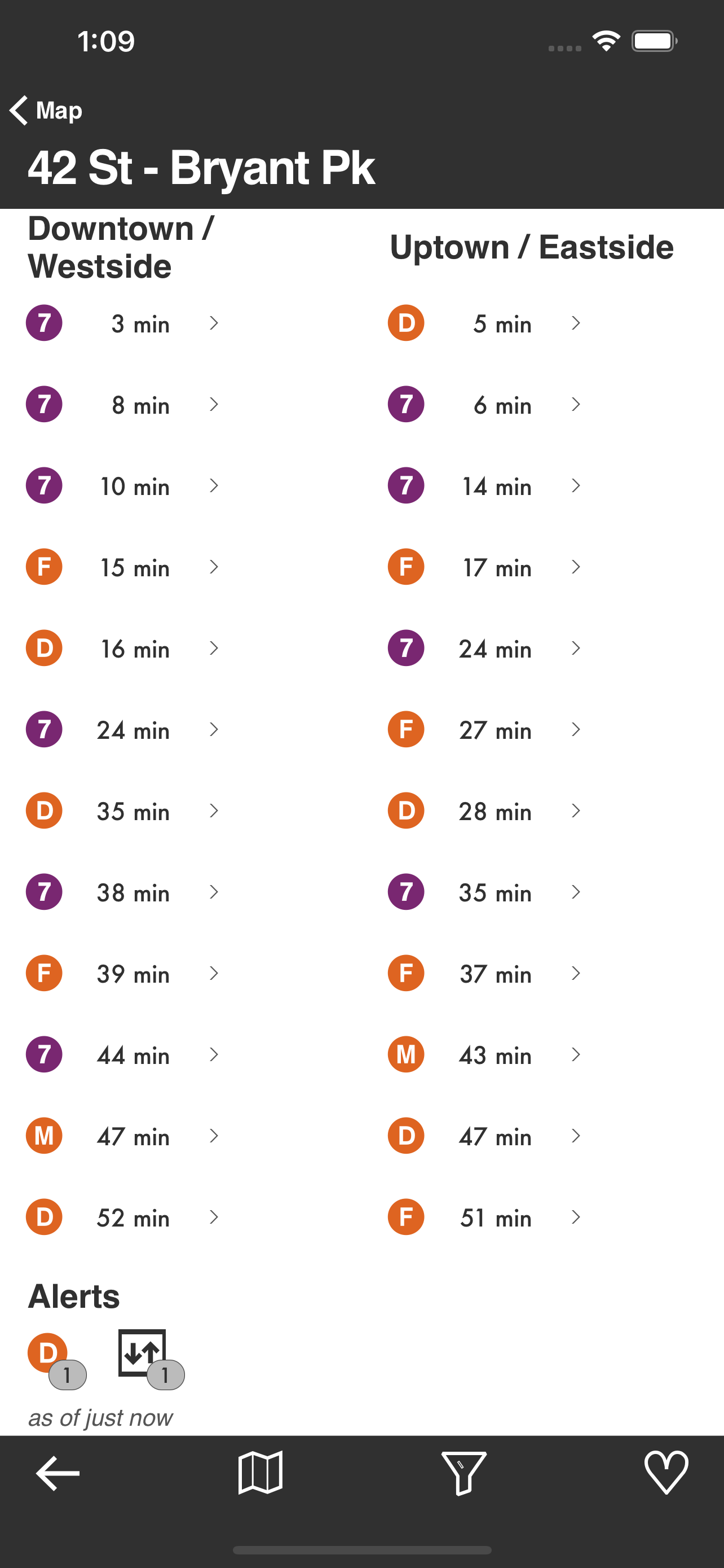 Underway NYC is a relatively simple but perfectly capable app and is my go-to for arrival time and train service information. It shows the trains actually serving stations at that moment in time, accounting for re-routings and service changes very well. I love being able to click on a specific train and see how long until it reaches stations further down the line as it enables me to make informed decisions on connections. It doesn’t provide routing information but if you have a general sense of direction for the subway system this should be all you need to get from A to B. Highly recommended.