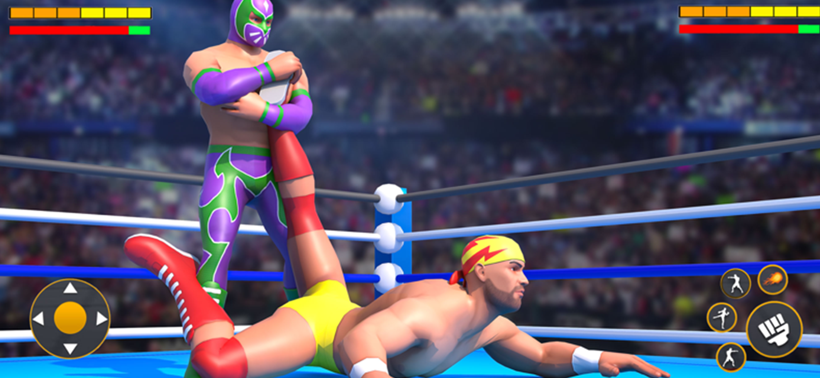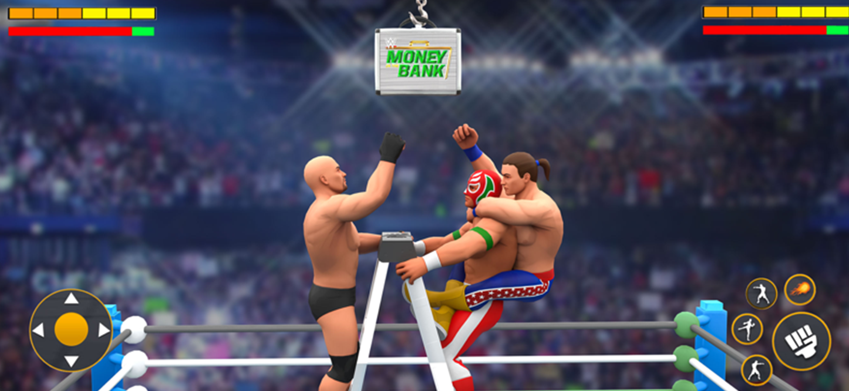 After playing the game for about 10 minutes, I realized that the graphics didn't look as good as they did when I first downloaded it. Also, instead of feeling like a wrestling game, it felt more like a Mortal Kombat game. On top of that, there were way too many ads! The gameplay was pretty good overall, but there was a confusing moment with the game's logo. It showed a ladder leading to something on top, but when actually playing the game, there was nothing up there. Instead, players could just make their characters jump around and throw punches and kicks. It's a bit disappointing when the expectations set by the visuals don't match the actual experience.