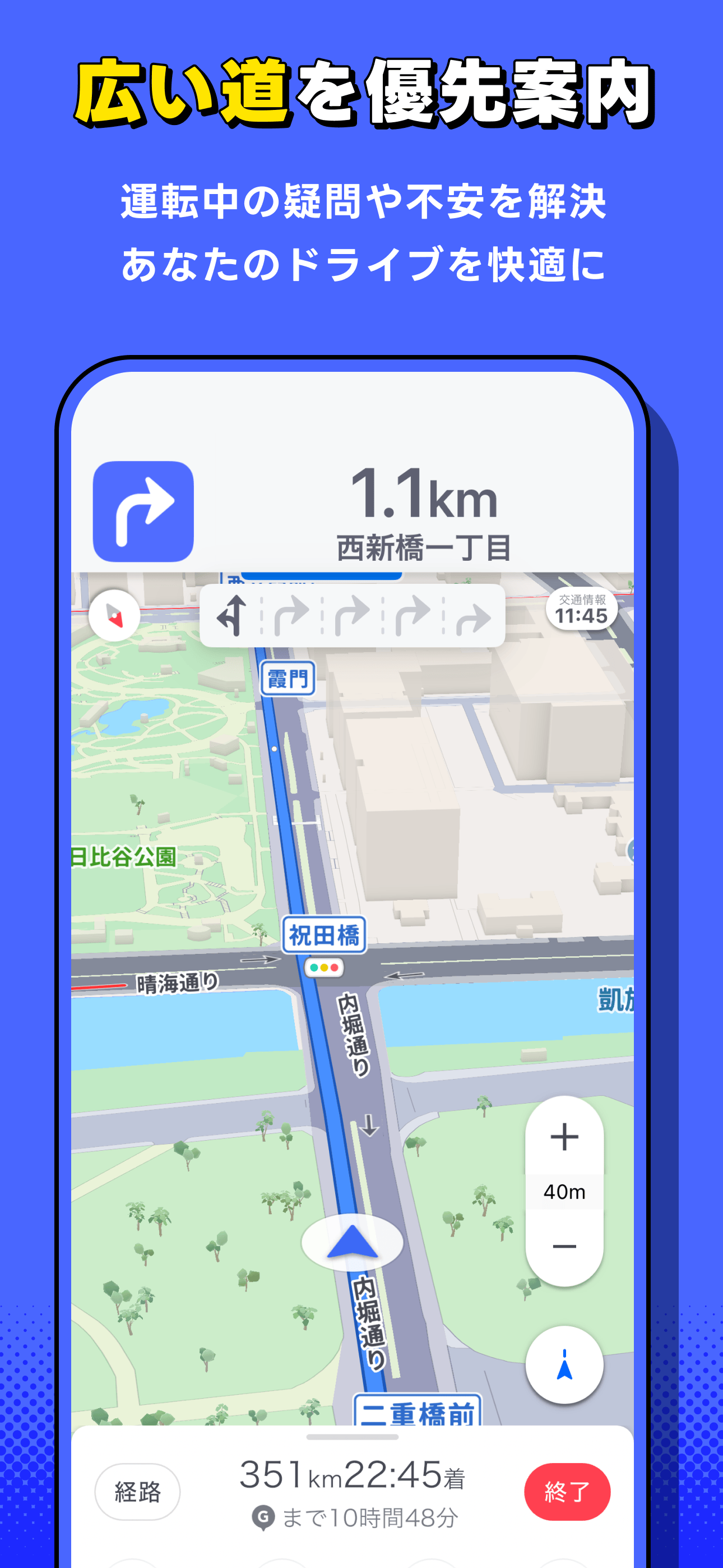 仕事柄車の運転が多いのでナビアプリは10年以上使ってみてGoogleマップアプリと比較して良い部分と駄目な部分を挙げておきます。 ◆良い部分 ・ナビの設定で車両が普通か軽自動車か選択できる。 ・住所の枝番まで検索でちゃんと位置が出せる。 ◆駄目な部分 ・マップ画面の道路線がかなりいい加減。 ・ルートが自動車専用バイパス等が絡む場合、バイパスを降りてというショートカットするべくルーチンが弱いのでど素人ルート臭が半端ない。 ・ナビ画面内の車両位置が実際より手前気味である故曲がらなければならない横道等を把握し辛く曲がり損ねる、もしくは一本手前を入ってしまうことが多い。 ◆まとめ 上記の優劣部分を使用目的と合わせて駄目な部分をどうにかしたい場合はGoogleマップを使うようにすること。逆にここで書いた良い部分はGoogleマップでは駄目な部分であるため使い分けが必要である。 理想とすればGoogleマップとこのアプリを足して二で割れれば一番良いモノになります。 ◆ちなみに 私はGoogleマップ、このアプリ、ゼンリンの配達アプリを使い分けてます。