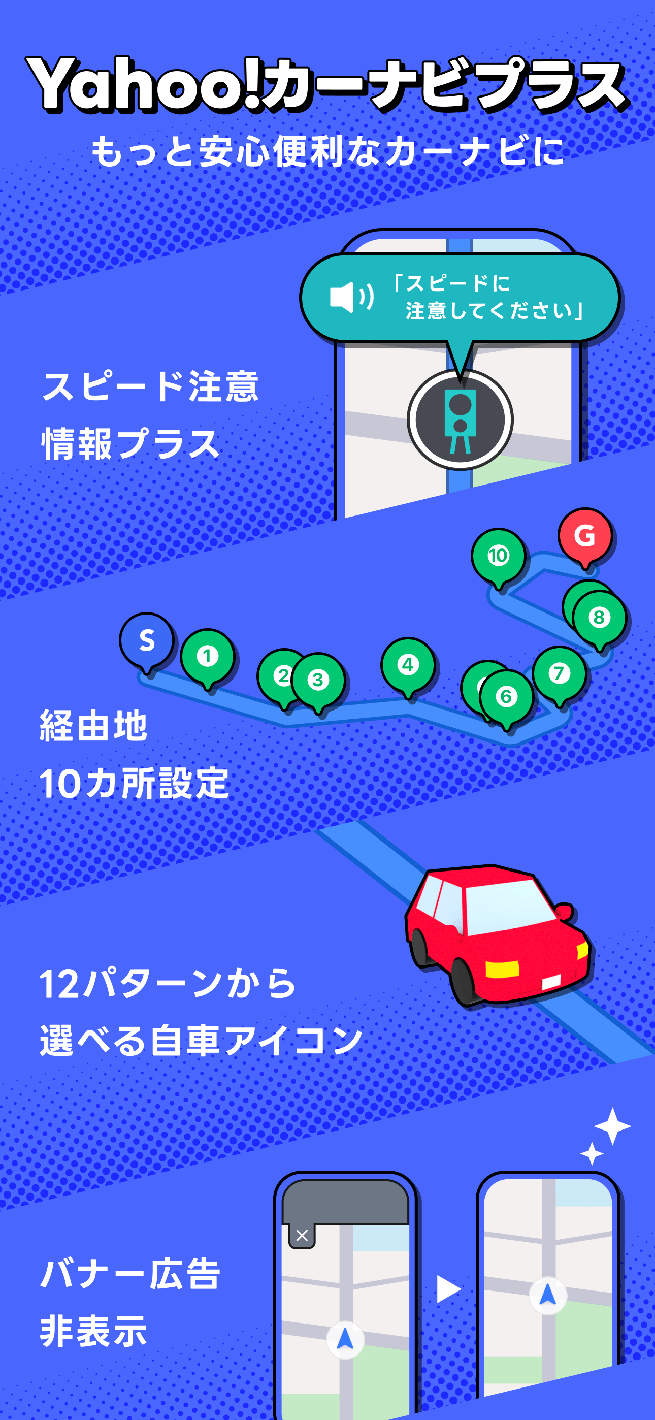 ヤフーカーナビはスマホで使える、本格カーナビです。最新の地図と丁寧な案内で、あなたを目的地までお連れします。 (1)道幅の広い道を優先案内 (2)交通規制や渋滞を考慮したルートを提案 (3)地図もナビも無料で自動更新 (4)高速道路の複雑なジャンクションはイラストで案内 (5)標識やオービスもお知ら...